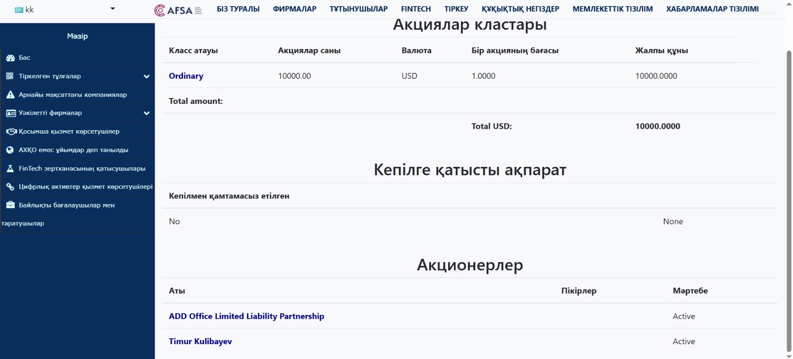 Астана халықаралық қаржы орталығының заңды тұлғалар тізбесінде Farabi Development Limited атты жеке компания тіркелді, деп хабарлайды Tizgin.kz.