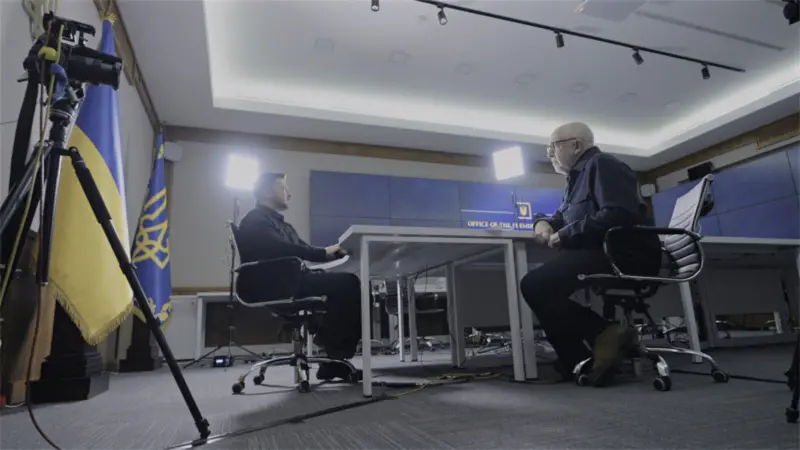 Біз Владимир Зеленскиймен Киевтің орталығындағы жақсы күзетілетін үкіметтік кварталдағы ғимараттардың бірінде сөйлестік. Сұхбат барысында ол негізінен украин тілінде сөйледі.