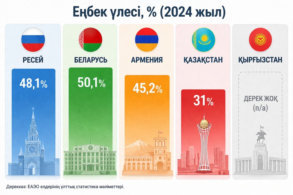 ЕАЭО елдерімен салыстырғанда айырмашылық тіпті айқын. 2024 жылы Ресейде еңбек үлесі 48,1%, Беларусьте 50,1%, Арменияда 45,2% болды. Ал Қазақстанда бұл көрсеткіш шамамен 31% деңгейінде қалып отыр. Яғни бұл елдерде жасалған құнның жартысына жуығы халыққа жалақы арқылы үлестірілсе, Қазақстанда ол үштен бір деңгейінде ғана.