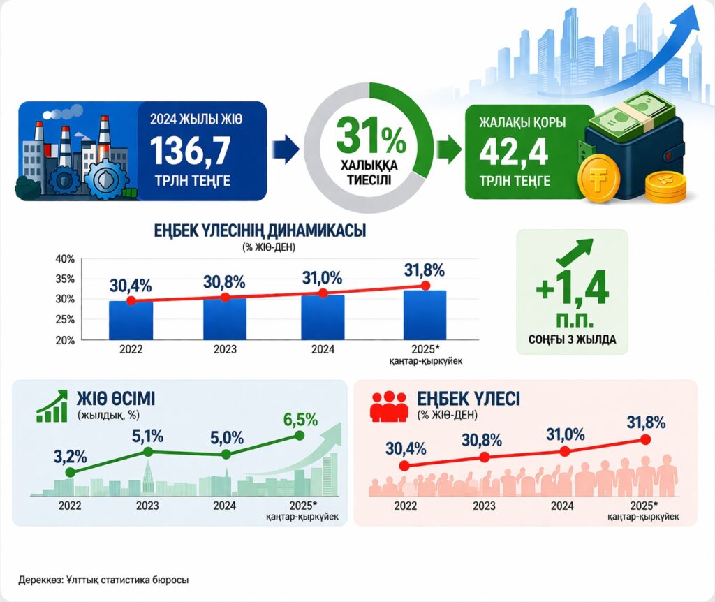 Мысалы, 2024 жылы Қазақстанның ЖІӨ-сі 136,7 трлн теңге болды. Соның ішінде еңбекақыға 42,4 трлн теңге ғана тиесілі. Яғни экономикада жасалған құнның шамамен үштен бірі ғана халыққа жалақы түрінде жетеді.