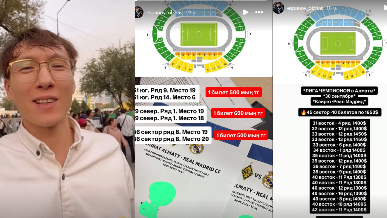 Сын певца Нурлана Еспанова Олжас Еспанов на своей странице в социальных сетях продаёт билеты на матч «Кайрат–Реал» по цене 500–760…